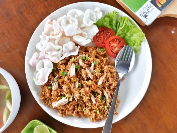 100 gr udang tanpa kepala 1 butir telur (kocok) 1 piring nasi 1 siung bawang putih(cincang) 2 siung bawang merah (cincang) 2 sdm saus tomat 1/2 sdt garam 1/3 sdt merica 2 sdm margarin