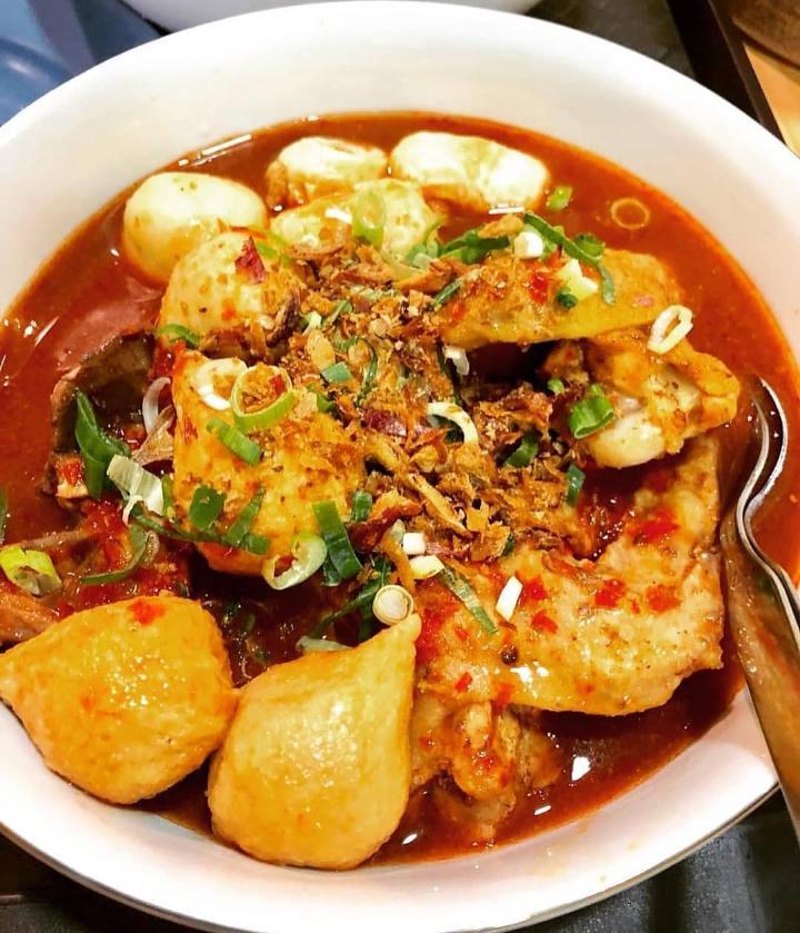 1 bks mie instan 1 genggam kerupuk mentah 1 genggam makaroni 1 genggam kwetiau basah 2 btr telur ayam 3 bh sayap ayam 6 bh ceker ayam 6 btr bakso sapi, belah empat bawang goreng secukupnya irisan daun bawang secukupnya garam secukupnya kaldu bubuk secukupnya gula pasir secukupnya minyak untuk menumis air secukupnya